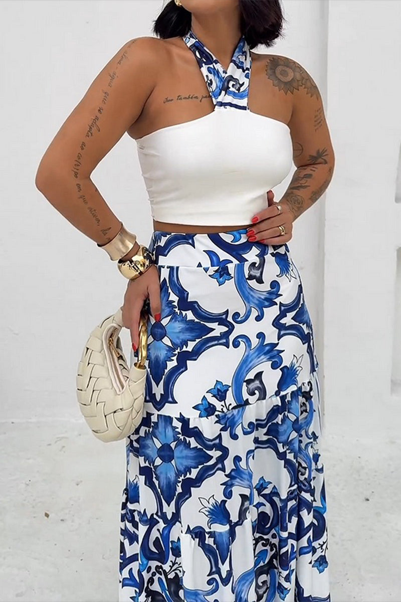 Casual Vacation Floral Print Lace Up Patchwork Ruffle Halter Sleeveless Two Pieces